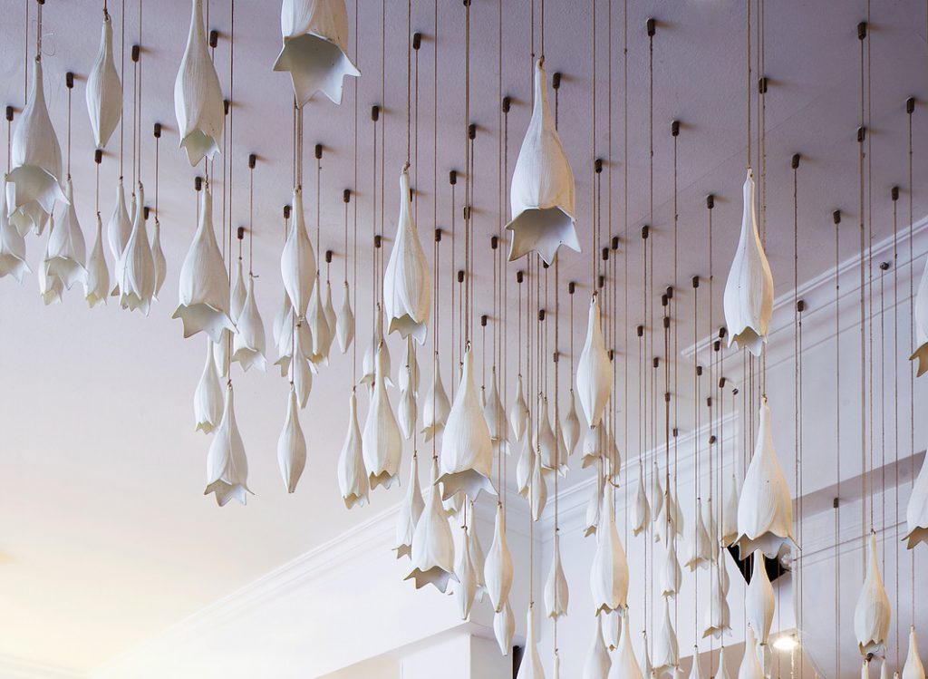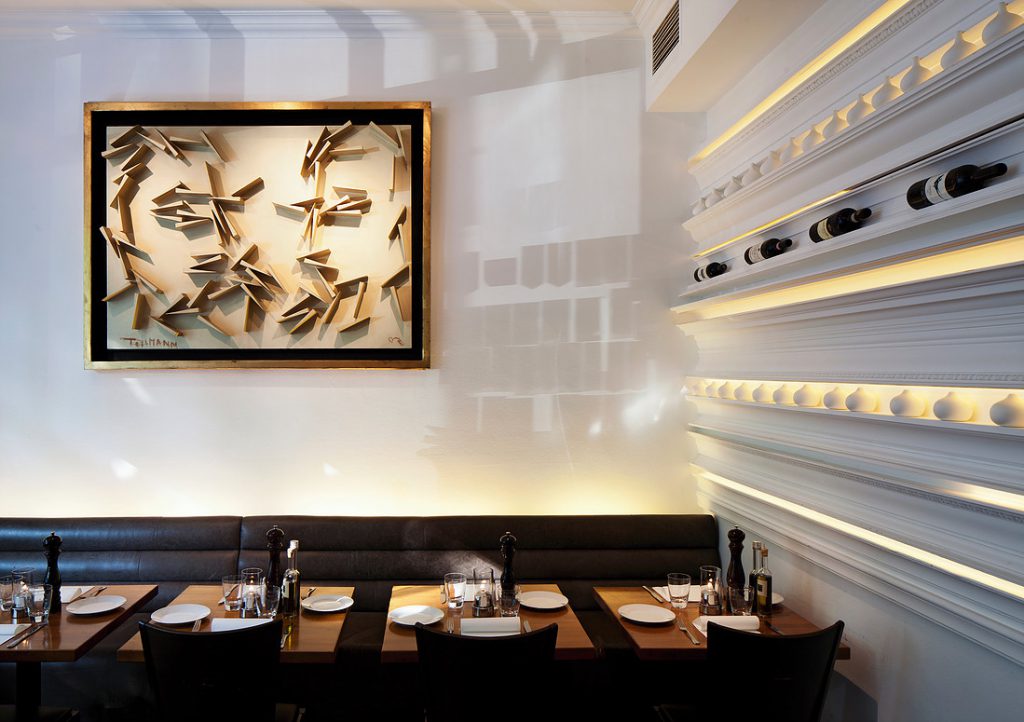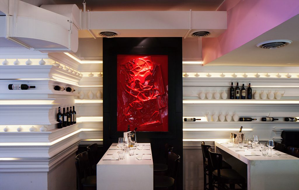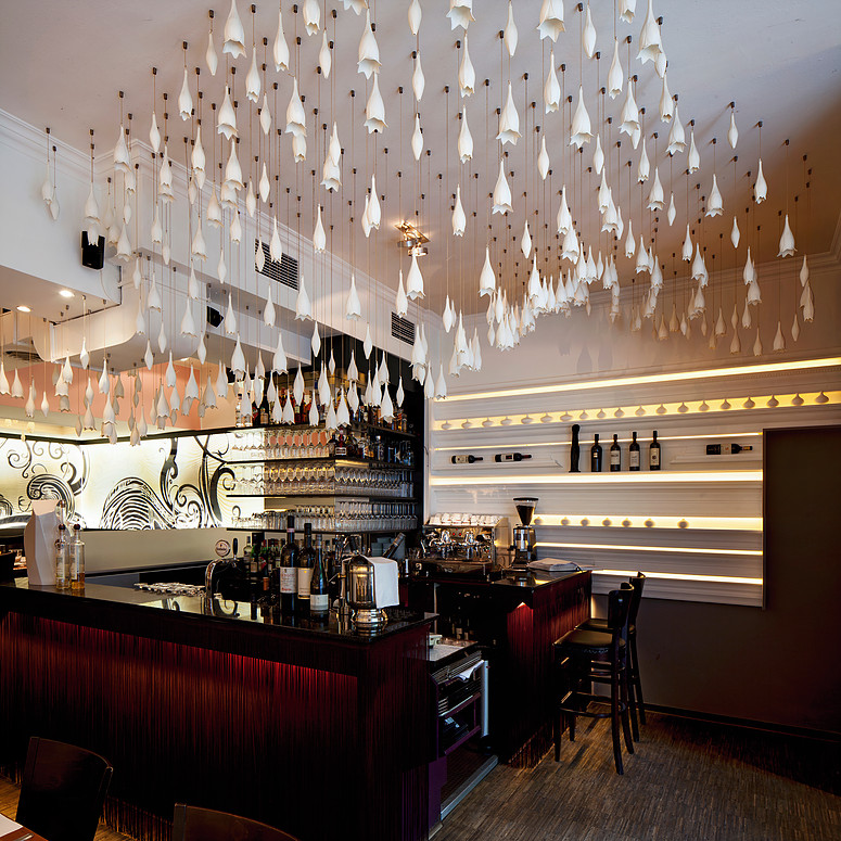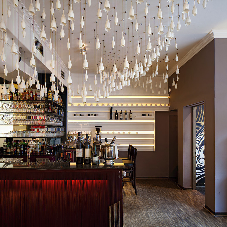 Während das 60 Quadratmeter kleine Ladenlokal bereits vollständig möbliert war, hat es Heilight sein eigentliches Herzstück zu verdanken – ein skulpturales Weinregal aus weißen Stuckleisten. Vorhandene Kunstwerke wurden in das Gestaltungskonzept integriert und ergänzt. Wie die im Barbereich von der Decke baumelnden Porzellanblumen kontrastiert auch das Ornament-Dekor der hinterleuchteten Wandelemente den ansonsten eher klassischen Look des Interieurs.